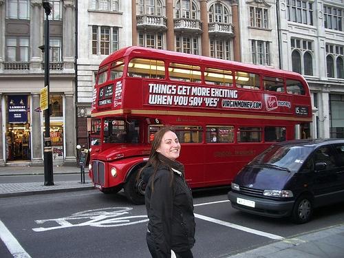 The image depicts a double decker bus, which is prominently displayed in the center of the image. The bus is red and has a large, bold sign on its roof that reads