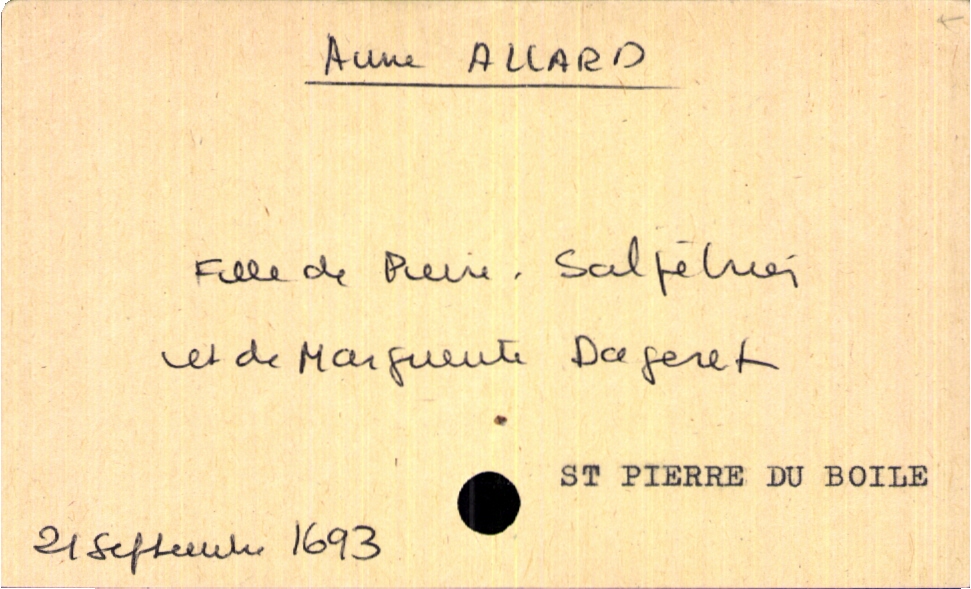 train | Tours | Index cards | 3fdff83e-38de-48cf-879a-057b83137df0 | <root><Baptême><Père><Nom>Allard</Nom><Prénom>Pierre</Prénom><Profession>salpètrier</Profession></Père><Mère><Nom>Dageret</Nom><Prénom>Marguerite</Prénom></Mère><Enfant><Filiation>fille</Filiation><Prénom>Anne</Prénom><DateDeNaissance>21 septembre 1693</DateDeNaissance><LieuDeNaissance>Saint Pierre du Boile</LieuDeNaissance></Enfant></Baptême></root> | |