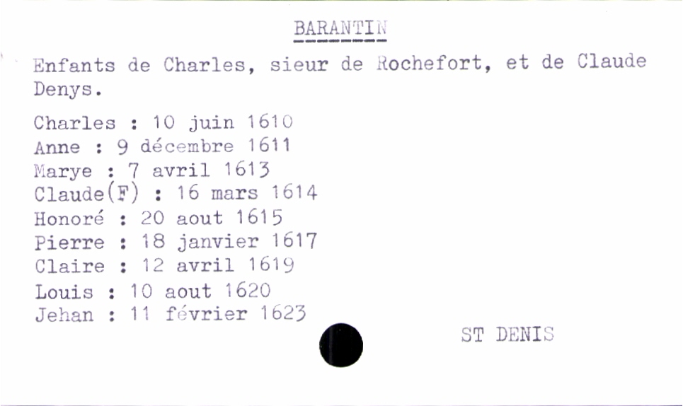 train | Tours | Index cards | 2fc6dfc4-d32e-4184-8413-1dccd74ed8e9 | <root><Baptême><Père><Nom>Barantin</Nom><Prénom>Charles</Prénom><Profession>sieur de Rochefort</Profession></Père><Mère><Nom>Denys</Nom><Prénom>Claude</Prénom></Mère><Enfant><Filiation>fils</Filiation><Prénom>Jehan</Prénom><DateDeNaissance>11 février 1623</DateDeNaissance><LieuDeNaissance>Saint Denis</LieuDeNaissance></Enfant></Baptême></root> | |