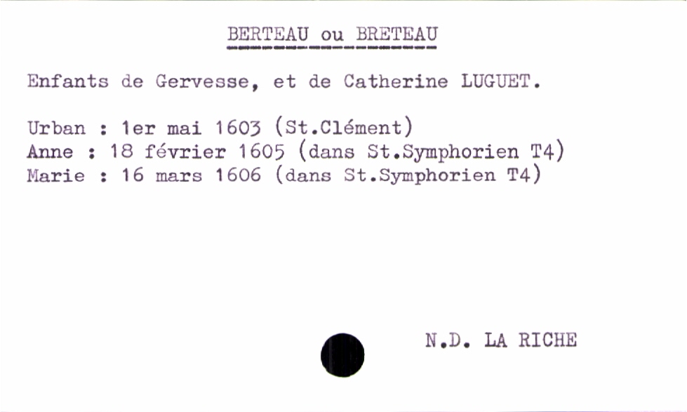 train | Tours | Index cards | 14c5a35d-a160-4b71-a970-b79d56cd61d0 | <root><Baptême><Père><Nom>Berteau</Nom><Prénom>Gervesse</Prénom></Père><Mère><Nom>Luguet</Nom><Prénom>Catherine</Prénom></Mère><Enfant><Filiation>fille</Filiation><Prénom>Marie</Prénom><DateDeNaissance>16 mars 1606</DateDeNaissance><LieuDeNaissance>Saint Symphorien</LieuDeNaissance></Enfant></Baptême><Paroisse>Notre Dame La Riche</Paroisse><Observations>Nom : Berteau ou Breteau</Observations></root> | |