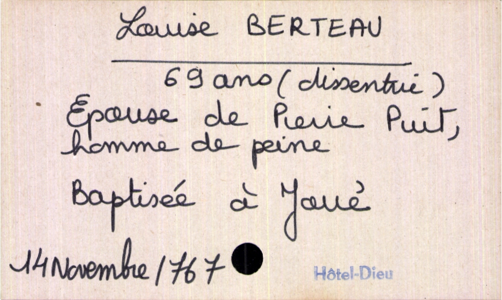 train | Tours | Index cards | 0805e954-bdad-4c91-aaf7-a4d05b6a5ec0 | <root><Décès><Défunt><Nom>Berteau</Nom><Prénom>Louise</Prénom><Sexe>F</Sexe><Âge>69 ans</Âge><LieuDeNaissance>Joué</LieuDeNaissance><Statut>marié(e)</Statut></Défunt><Conjoint><Nom>Puit</Nom><Prénom>Pierre</Prénom><Profession>homme de peine</Profession></Conjoint></Décès><Année>1767</Année><Mois>novembre</Mois><Jour>14</Jour></root> | |