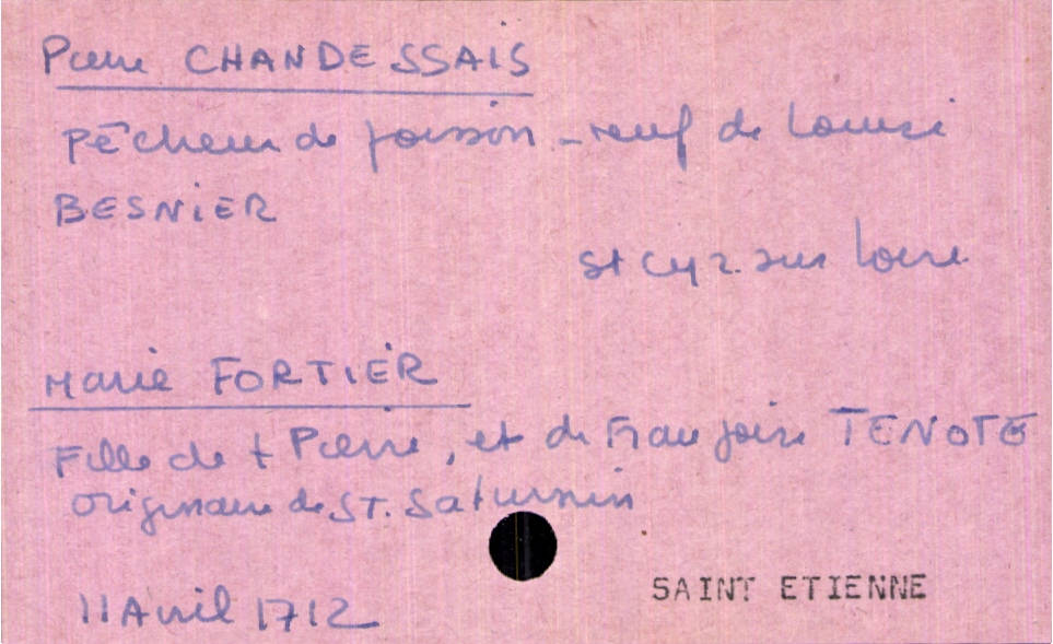 train | Tours | Index cards | 36eaaebf-0dfb-4077-90e7-efd8dbb233b1 | <root><Mariage><Marié><Nom>Chandessais</Nom><Prénom>Pierre</Prénom><Profession>pêcheur de poisson</Profession><Statut>veuf</Statut><LieuDeNaissance>Saint Cyr sur Loire</LieuDeNaissance><ConjointPremièreNoce><Nom>Besnier</Nom><Prénom>Louise</Prénom></ConjointPremièreNoce></Marié><Mariée><Nom>Fortier</Nom><Prénom>Marie</Prénom><LieuDeNaissance>Saint Saturnin</LieuDeNaissance><Père><Nom>Fortier</Nom><Prénom>Pierre</Prénom><Statut>décédé</Statut></Père><Mère><Nom>Tenote</Nom><Prénom>Françoise</Prénom></Mère></Mariée></Mariage><Année>1712</Année><Mois>avril</Mois><Jour>11</Jour><Paroisse>Saint Etienne</Paroisse></root> | |