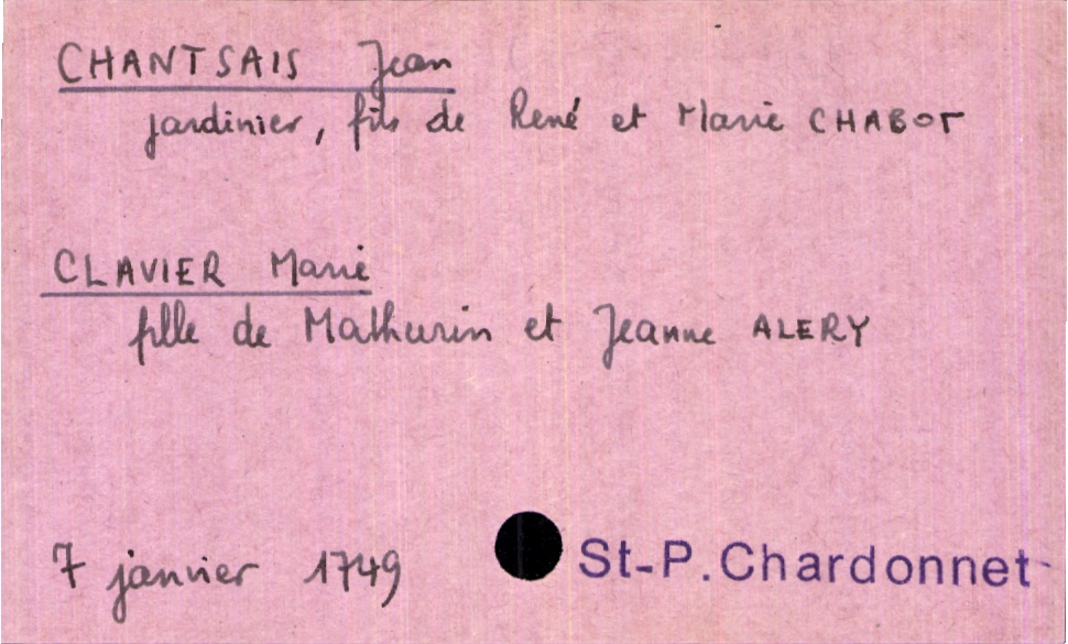 train | Tours | Index cards | ff47bf26-14ab-48d3-b495-2cd9e2602eb1 | <root><Mariage><Marié><Nom>Chantsais</Nom><Prénom>Jean</Prénom><Profession>jardinier</Profession><Père><Nom>Chantsais</Nom><Prénom>René</Prénom></Père><Mère><Nom>Chabot</Nom><Prénom>Marie</Prénom></Mère></Marié><Mariée><Nom>Clavier</Nom><Prénom>Marie</Prénom><Père><Nom>Clavier</Nom><Prénom>Mathurin</Prénom></Père><Mère><Nom>Alery</Nom><Prénom>Jeanne</Prénom></Mère></Mariée></Mariage><Année>1749</Année><Mois>janvier</Mois><Jour>7</Jour><Paroisse>Saint-Pierre du Chardonnet</Paroisse></root> | |