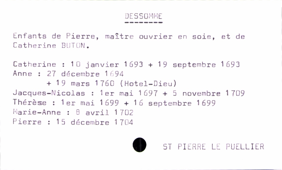 train | Tours | Index cards | b06a46a4-cac1-4de2-87ae-473b514f54f7 | <root><Baptême><Père><Nom>Dessomme</Nom><Prénom>Pierre</Prénom><Profession>maître ouvrier en soie</Profession></Père><Mère><Nom>Buton</Nom><Prénom>Catherine</Prénom></Mère><Enfant><Filiation>fils</Filiation><Prénom>Pierre</Prénom><DateDeNaissance>15 décembre 1704</DateDeNaissance><LieuDeNaissance>Saint Pierre le Puellier</LieuDeNaissance><DateDeDécès>16 septembre 1699</DateDeDécès><LieuDeDécès>Saint Pierre le Puellier</LieuDeDécès></Enfant></Baptême></root> | |