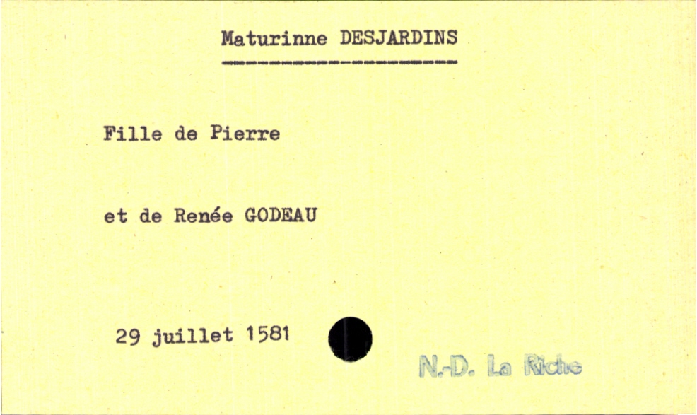 train | Tours | Index cards | 7a8d8e3e-567c-44ec-af8d-e486a4f6f92e | <root><Baptême><Père><Nom>Desjardins</Nom><Prénom>Pierre</Prénom></Père><Mère><Nom>Godeau</Nom><Prénom>Renée</Prénom></Mère><Enfant><Filiation>fille</Filiation><Prénom>Maturinne</Prénom><DateDeNaissance>29 juillet 1581</DateDeNaissance><LieuDeNaissance>Notre-Dame La Riche</LieuDeNaissance></Enfant></Baptême></root> | |