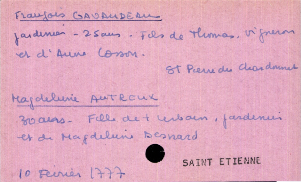train | Tours | Index cards | e68b6a37-eda5-4731-a87f-9d050b468341 | <root><Mariage><Marié><Nom>Gavaudeau</Nom><Prénom>François</Prénom><Profession>jardinier</Profession><Âge>25 ans</Âge><LieuDeNaissance>Saint Pierre du Chardonnet</LieuDeNaissance><Père><Nom>Gavaudeau</Nom><Prénom>Thomas</Prénom><Profession>vigneron</Profession></Père><Mère><Nom>Cosson</Nom><Prénom>Anne</Prénom></Mère></Marié><Mariée><Nom>Autreux</Nom><Prénom>Magdeleine</Prénom><Âge>30 ans</Âge><Père><Nom>Autreux</Nom><Prénom>Urbain</Prénom><Profession>jardinier</Profession><Statut>décédé</Statut></Père><Mère><Nom>Besnard</Nom><Prénom>Magdeleine</Prénom></Mère></Mariée></Mariage><Année>1777</Année><Mois>février</Mois><Jour>10</Jour><Paroisse>Saint Etienne</Paroisse></root> | |
