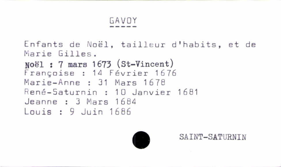train | Tours | Index cards | 71926ddc-db31-400e-9102-a6ffd0a99de4 | <root><Baptême><Père><Nom>Gavoy</Nom><Prénom>Noël</Prénom><Profession>tailleur d'habits</Profession></Père><Mère><Nom>Gilles</Nom><Prénom>Marie</Prénom></Mère><Enfant><Filiation>fils</Filiation><Prénom>Louis</Prénom><DateDeNaissance>9 juin 1686</DateDeNaissance><LieuDeNaissance>Saint-Saturnin</LieuDeNaissance></Enfant></Baptême></root> | |