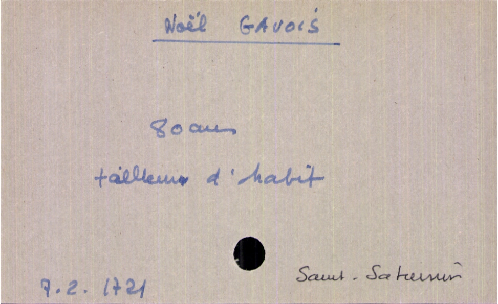 train | Tours | Index cards | ac0acff2-31f6-4270-8089-10ca7795b636 | <root><Décès><Défunt><Nom>Gavois</Nom><Prénom>Noël</Prénom><Sexe>H</Sexe><Âge>80 ans</Âge><Profession>tailleur d'habit</Profession></Défunt></Décès><Année>1721</Année><Mois>2</Mois><Jour>7</Jour><Paroisse>Saint-Saturnin</Paroisse></root> | |