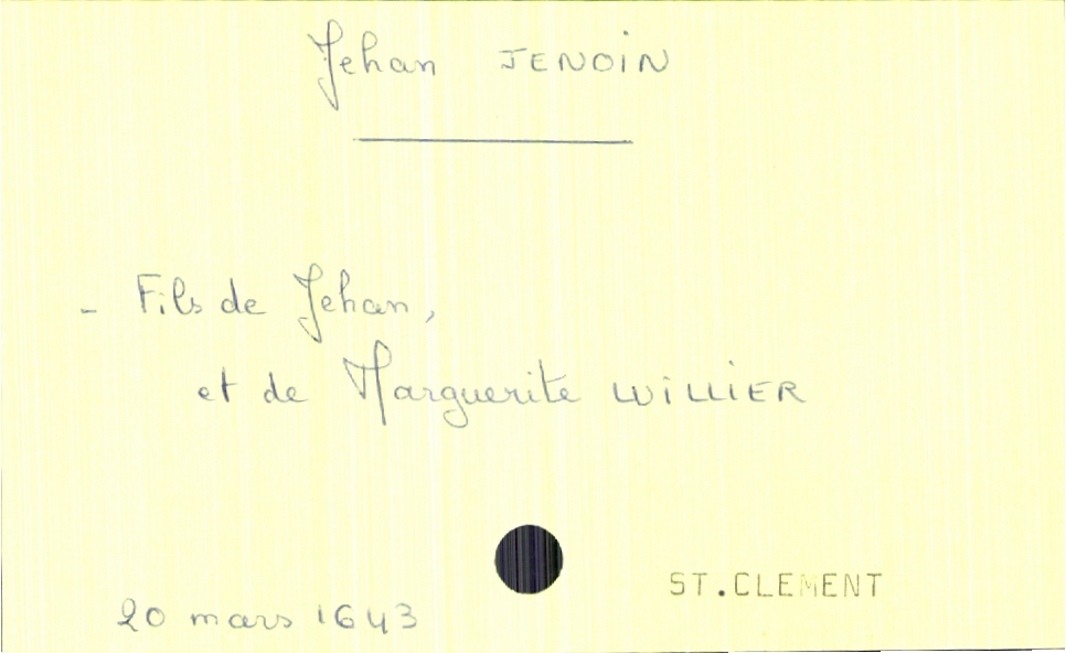 train | Tours | Index cards | 28b0d114-8241-4ade-a520-edf61993ec0f | <root><Baptême><Père><Nom>Jenoin</Nom><Prénom>Jehan</Prénom></Père><Mère><Nom>Luillier</Nom><Prénom>Marguerite</Prénom></Mère><Enfant><Filiation>fils</Filiation><Prénom>Jehan</Prénom><DateDeNaissance>20 mars 1643</DateDeNaissance><LieuDeNaissance>Saint Clément</LieuDeNaissance></Enfant></Baptême></root> | |