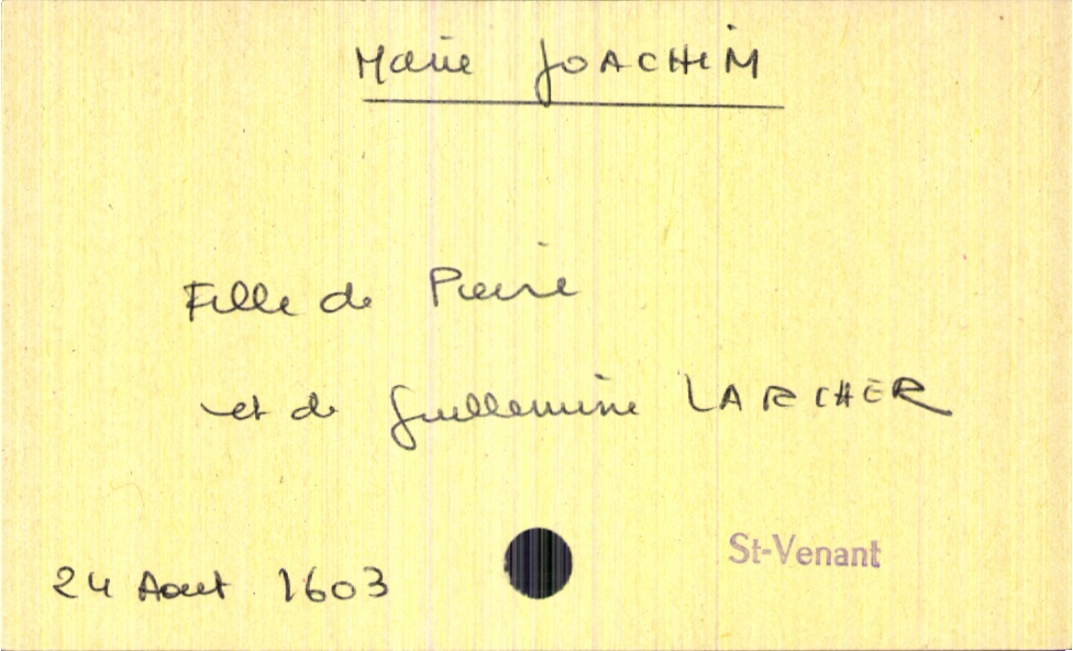 train | Tours | Index cards | f3303681-dbf2-4d35-97ed-ad9fa1df5708 | <root><Baptême><Père><Nom>Joachim</Nom><Prénom>Pierre</Prénom></Père><Mère><Nom>Larcher</Nom><Prénom>Guillemine</Prénom></Mère><Enfant><Filiation>fille</Filiation><Prénom>Marie</Prénom><DateDeNaissance>24 août 1603</DateDeNaissance><LieuDeNaissance>Saint-Venant</LieuDeNaissance></Enfant></Baptême></root> | |