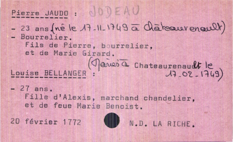 train | Tours | Index cards | 85716525-ca1b-4011-8acb-a70766feb857 | <root><Mariage><Marié><Nom>Jaudo</Nom><Prénom>Pierre</Prénom><Profession>bourrelier</Profession><Âge>23 ans</Âge><DateDeNaissance>17-11-1749</DateDeNaissance><LieuDeNaissance>Châteaurenault</LieuDeNaissance><Père><Nom>Jaudo</Nom><Prénom>Pierre</Prénom><Profession>bourrelier</Profession></Père><Mère><Nom>Girard</Nom><Prénom>Marie</Prénom></Mère></Marié><Mariée><Nom>Bellanger</Nom><Prénom>Louise</Prénom><Âge>27 ans</Âge><Père><Nom>Bellanger</Nom><Prénom>Alexis</Prénom><Profession>marchand chandelier</Profession><Statut>veuf</Statut></Père><Mère><Nom>Benoist</Nom><Prénom>Marie</Prénom><Statut>décédée</Statut></Mère></Mariée></Mariage><Année>1772</Année><Mois>février</Mois><Jour>20</Jour><Paroisse>Notre Dame La Riche</Paroisse></root> | |