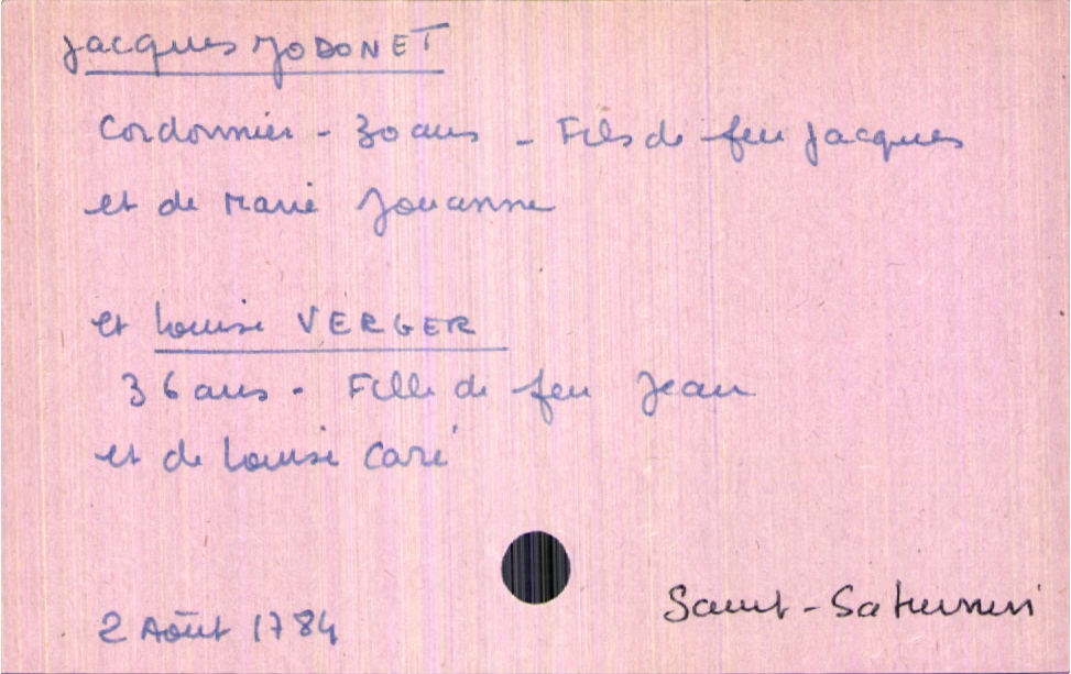 train | Tours | Index cards | 0ae17997-c904-4fbc-9248-1dfa0d86823c | <root><Mariage><Marié><Nom>Jodonet</Nom><Prénom>Jacques</Prénom><Profession>cordonnier</Profession><Âge>30 ans</Âge><Père><Nom>Jodonet</Nom><Prénom>Jacques</Prénom><Statut>décédé</Statut></Père><Mère><Nom>Jouanne</Nom><Prénom>Marie</Prénom></Mère></Marié><Mariée><Nom>Verger</Nom><Prénom>Louise</Prénom><Âge>36 ans</Âge><Père><Nom>Verger</Nom><Prénom>Jean</Prénom></Père><Mère><Nom>Caré</Nom><Prénom>Louise</Prénom></Mère></Mariée></Mariage><Année>1784</Année><Mois>août</Mois><Jour>1784</Jour><Paroisse>Saint-Saturnin</Paroisse></root> | |
