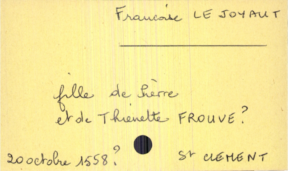 train | Tours | Index cards | 4a411d80-ad3d-4604-9656-4c1bc8dbd913 | <root><Baptême><Père><Nom>Lejoyaut</Nom><Prénom>Pierre</Prénom></Père><Mère><Nom>Frouve</Nom><Prénom>Thienette</Prénom></Mère><Enfant><Filiation>fille</Filiation><Prénom>Françoise</Prénom><DateDeNaissance>20 octobre 1558</DateDeNaissance><LieuDeNaissance>Saint Clement</LieuDeNaissance></Enfant></Baptême><Observations>interrogation sur la date de l'acte et le nom de la mère</Observations></root> | |