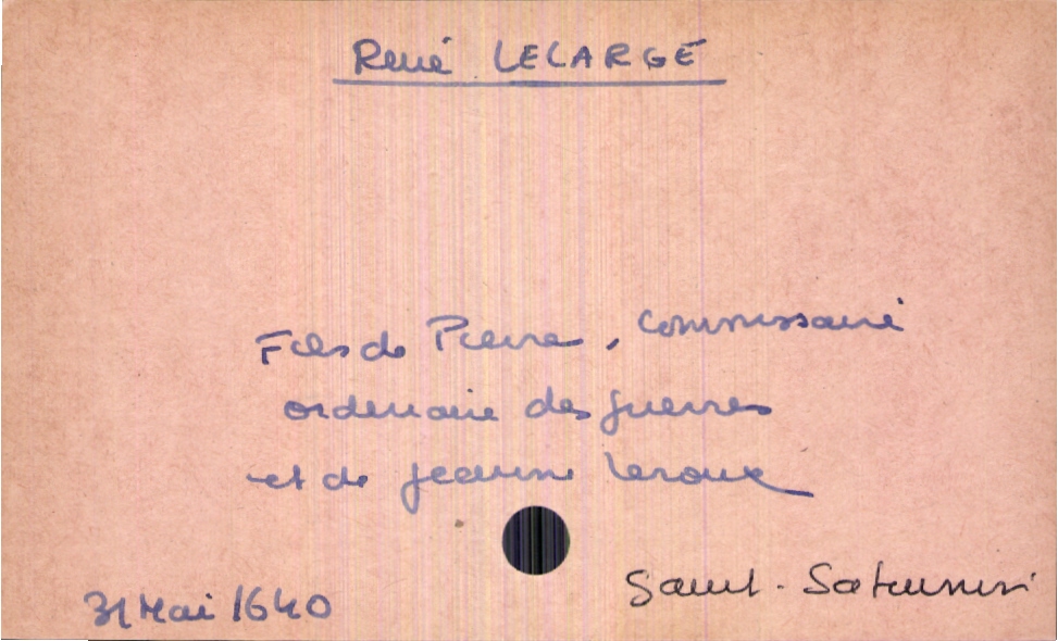 train | Tours | Index cards | 762c1c51-b6db-4216-b5dd-742a2ebd7df3 | <root><Baptême><Père><Nom>Lelarge</Nom><Prénom>Pierre</Prénom><Profession>commissaire ordinaire des guerres</Profession></Père><Mère><Nom>Leroux</Nom><Prénom>Jeanne</Prénom></Mère><Enfant><Filiation>fils</Filiation><Prénom>René</Prénom><DateDeNaissance>31 mai 1640</DateDeNaissance><LieuDeNaissance>Saint-Saturnin</LieuDeNaissance></Enfant></Baptême></root> | |