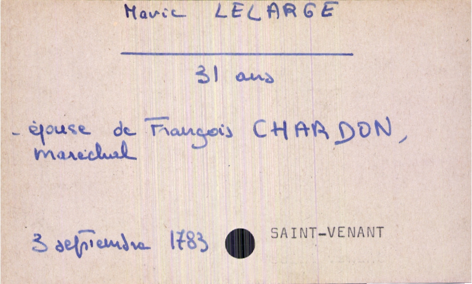train | Tours | Index cards | 1578100f-2093-4af7-bf9a-8ad654e315e0 | <root><Décès><Défunt><Nom>Lelarge</Nom><Prénom>Marie</Prénom><Sexe>F</Sexe><Âge>31 ans</Âge><Statut>marié(e)</Statut></Défunt><Conjoint><Nom>Chardon</Nom><Prénom>François</Prénom><Profession>maréchal</Profession></Conjoint></Décès><Année>1783</Année><Mois>septembre</Mois><Jour>3</Jour><Paroisse>Saint Venant</Paroisse></root> | |