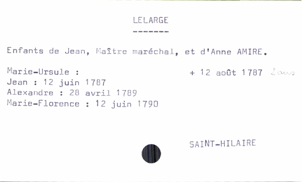 train | Tours | Index cards | ea6a7194-c53f-45a3-94ac-0b222328b219 | <root><Baptême><Père><Nom>Lelarge</Nom><Prénom>Jean</Prénom><Profession>maître maréchal</Profession></Père><Mère><Nom>Amire</Nom><Prénom>Anne</Prénom></Mère><Enfant><Filiation>fille</Filiation><Prénom>Marie-Florence</Prénom><DateDeDécès>12 août 1787</DateDeDécès><LieuDeDécès>Saint-Hilaire</LieuDeDécès><DateDeNaissance>12 juin 1790</DateDeNaissance><LieuDeNaissance>Saint-Hilaire</LieuDeNaissance></Enfant></Baptême><Observations>Marie-Ursule : 2 ans à sa mort</Observations></root> | |
