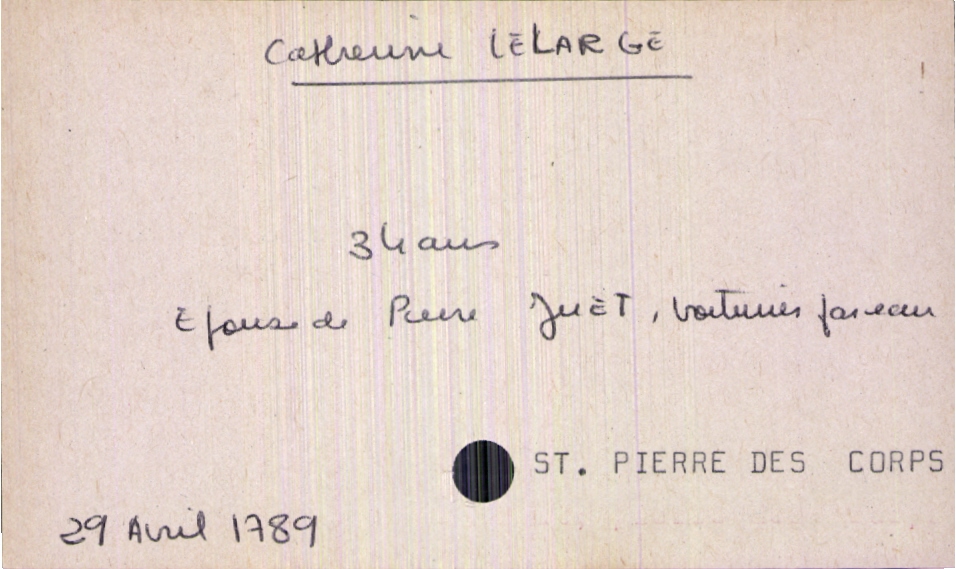 train | Tours | Index cards | 1bf62755-4c16-4d21-8792-5a87df9a43cb | <root><Décès><Défunt><Nom>Lelarge</Nom><Prénom>Catherine</Prénom><Sexe>F</Sexe><Âge>34 ans</Âge><Statut>marié(e)</Statut></Défunt><Conjoint><Nom>Juet</Nom><Prénom>Pierre</Prénom><Profession>voiturier par eau</Profession></Conjoint></Décès><Année>1789</Année><Mois>avril</Mois><Jour>29</Jour><Paroisse>Saint Pierre des Corps</Paroisse></root> | |