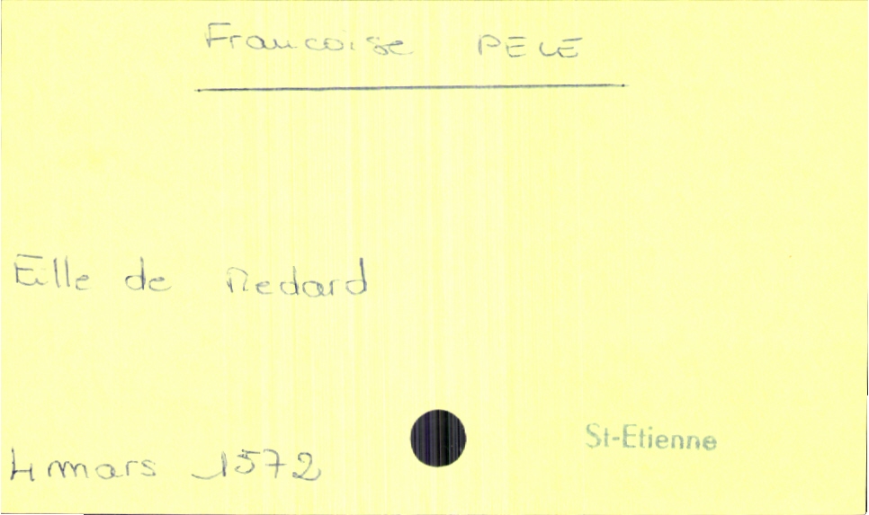 train | Tours | Index cards | 5f45402f-401f-4619-87d1-c06f6d67ce5e | <root><Baptême><Père><Nom>Pele</Nom><Prénom>Medard</Prénom></Père><Enfant><Filiation>fille</Filiation><Prénom>Françoise</Prénom><DateDeNaissance>4 mars 1572</DateDeNaissance><LieuDeNaissance>Saint-Etienne</LieuDeNaissance></Enfant></Baptême></root> | |