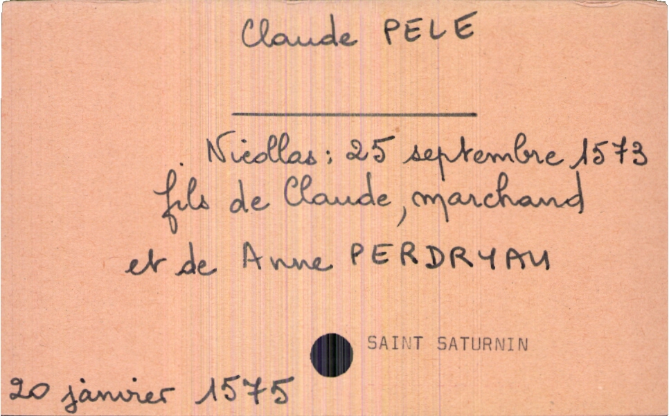 train | Tours | Index cards | b00219e3-0fab-4e1b-a715-9518a2528a12 | <root><Baptême><Père><Nom>Pele</Nom><Prénom>Claude</Prénom><Profession>marchand</Profession></Père><Mère><Nom>Perdryam</Nom><Prénom>Anne</Prénom></Mère><Enfant><Filiation>fils</Filiation><Prénom>Claude</Prénom><DateDeNaissance>20 janvier 1575</DateDeNaissance><LieuDeNaissance>Saint Saturnin</LieuDeNaissance></Enfant></Baptême></root> | |