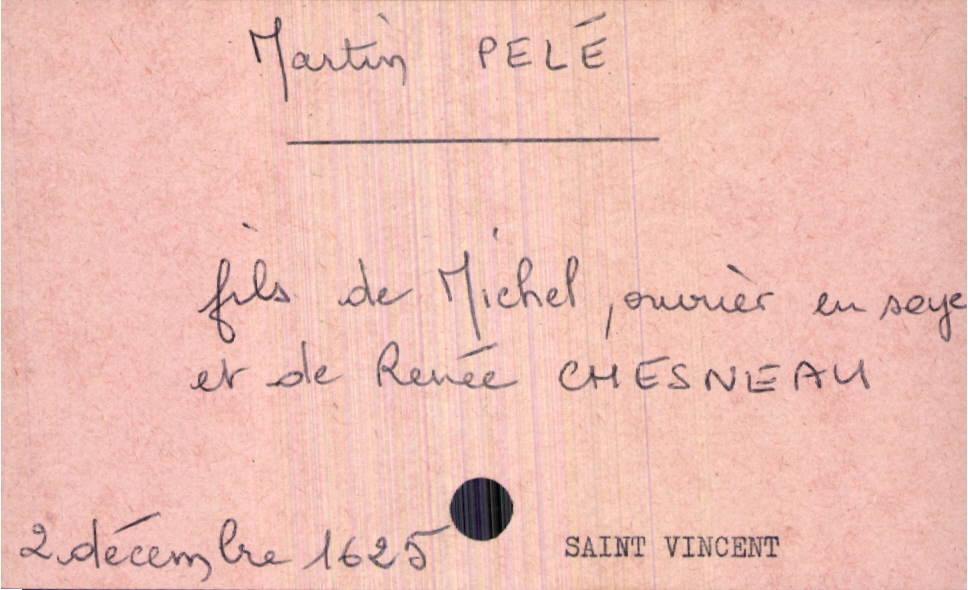 train | Tours | Index cards | c0607598-ecba-4c99-a5a7-7a1797829fd1 | <root><Baptême><Père><Nom>Pelé</Nom><Prénom>Michel</Prénom><Profession>ouvrier en soie</Profession></Père><Mère><Nom>Chesneau</Nom><Prénom>Renée</Prénom></Mère><Enfant><Filiation>fils</Filiation><Prénom>Martin</Prénom></Enfant></Baptême><Année>1625</Année><Mois>décembre</Mois><Jour>2</Jour><Paroisse>Saint Vincent</Paroisse></root> | |