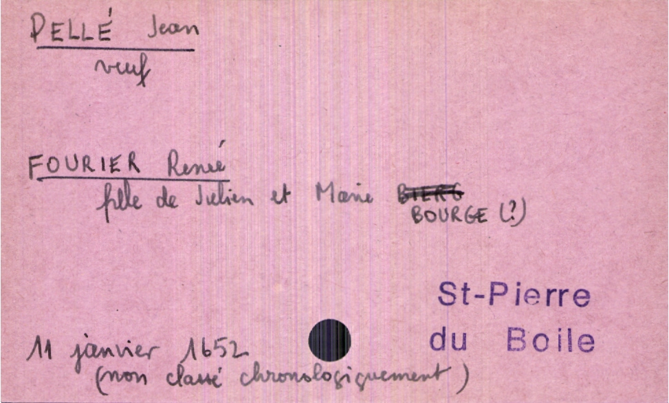 train | Tours | Index cards | b94ad358-f930-44db-9b1e-324c42489ac9 | <root><Mariage><Marié><Nom>Pellé</Nom><Prénom>Jean</Prénom><Statut>veuf</Statut></Marié><Mariée><Nom>Fourier</Nom><Prénom>Renée</Prénom><Père><Nom>Fourier</Nom><Prénom>Julien</Prénom></Père><Mère><Nom>Bourge (?)</Nom><Prénom>Marie</Prénom></Mère></Mariée></Mariage><Année>1652</Année><Mois>janvier</Mois><Jour>11</Jour><Paroisse>Saint-Pierre du Boile</Paroisse><Observations>non classé chronologiquement</Observations></root> | |