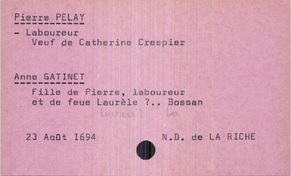train | Tours | Index cards | e44dc4c2-0fa4-4af5-867d-d041a316d344 | <root><Mariage><Marié><Nom>Pelay</Nom><Prénom>Pierre</Prénom><Profession>laboureur</Profession><Statut>veuf</Statut><ConjointPremièreNoce><Nom>Crespier</Nom><Prénom>Catherine</Prénom></ConjointPremièreNoce></Marié><Mariée><Nom>Gatinet</Nom><Prénom>Anne</Prénom><Père><Nom>Gatinet</Nom><Prénom>Pierre</Prénom><Profession>laboureur</Profession></Père><Mère><Nom>Laurèle</Nom><Prénom>Bossan</Prénom></Mère></Mariée></Mariage><Année>1694</Année><Mois>août</Mois><Jour>23</Jour><Paroisse>Notre Dame de La Riche</Paroisse><Observations>Interrogation sur le prénom de la mère de la mariée : Laurèle ou Lucrèce ?</Observations></root> | |