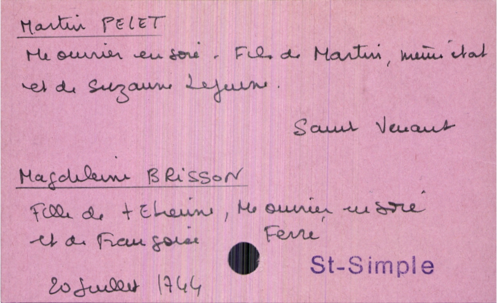 train | Tours | Index cards | bad9642a-4a50-416f-9520-efeead967470 | <root><Mariage><Marié><Nom>Pelet</Nom><Prénom>Martin</Prénom><Profession>maitre ouvrier en soie</Profession><LieuDeNaissance>Saint Venant</LieuDeNaissance><Père><Nom>Pelet</Nom><Prénom>Martin</Prénom><Profession>maitre ouvrier en soie</Profession></Père><Mère><Nom>Lejeune</Nom><Prénom>Suzanne</Prénom></Mère></Marié><Mariée><Nom>Brisson</Nom><Prénom>Magdeleine</Prénom><Père><Nom>Brisson</Nom><Prénom>Etienne</Prénom><Profession>maitre ouvrier en soie</Profession><Statut>décédé</Statut></Père><Mère><Nom>Ferré</Nom><Prénom>Françoise</Prénom></Mère></Mariée></Mariage><Année>1744</Année><Mois>juillet</Mois><Jour>20</Jour><Paroisse>Saint-Simple</Paroisse></root> | |
