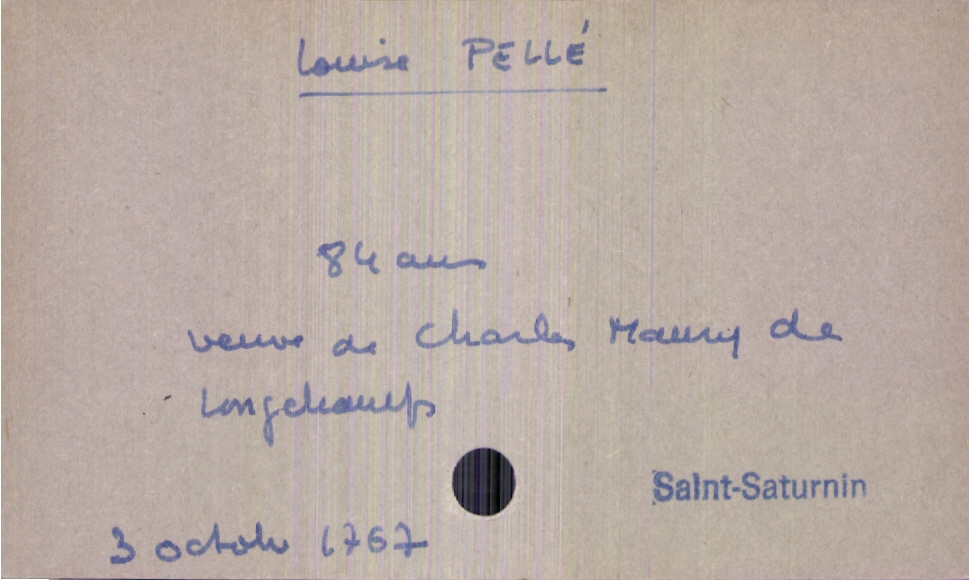train | Tours | Index cards | 4af058f0-6e34-42fe-84a0-2c78c46d1006 | <root><Décès><Défunt><Nom>Pellé</Nom><Prénom>Louise</Prénom><Sexe>F</Sexe><Âge>84 ans</Âge><Statut>veuf(ve)</Statut></Défunt><Conjoint><Nom>Maury de Longchamps</Nom><Prénom>Charles</Prénom><Statut>décédé(e)</Statut></Conjoint></Décès><Année>1767</Année><Mois>octobre</Mois><Jour>3</Jour></root> | |