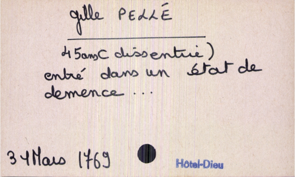 train | Tours | Index cards | 419d2ecc-b946-4688-8c14-f7c2ee7cd49e | <root><Décès><Défunt><Nom>Pellé</Nom><Prénom>Gille</Prénom><Âge>45 ans</Âge></Défunt></Décès><Année>1769</Année><Mois>mars</Mois><Jour>31</Jour><Observations>(dissentrie) entré dans un état de démence</Observations></root> | |