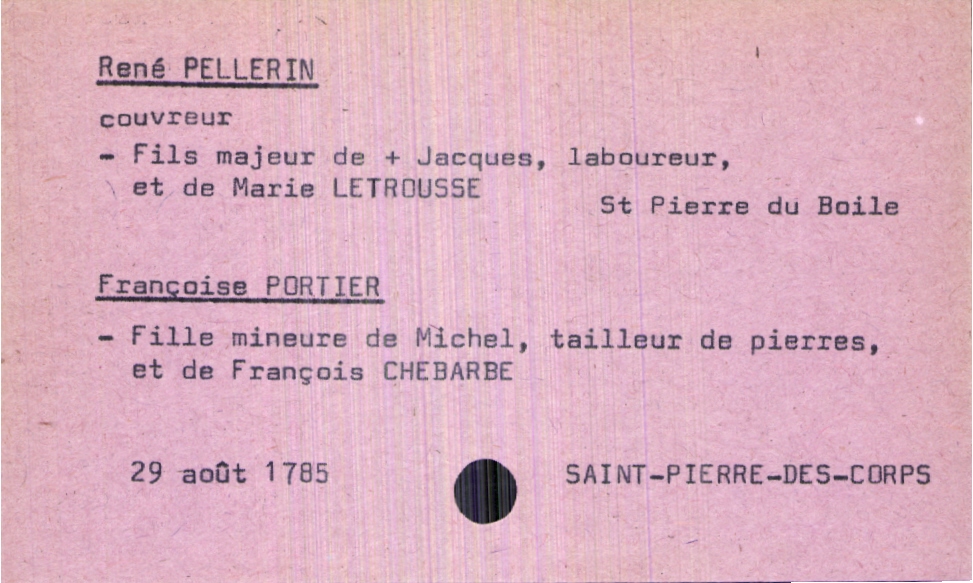 train | Tours | Index cards | 434017d5-bceb-4143-b075-187385dd37fa | <root><Mariage><Marié><Nom>Pellerin</Nom><Prénom>René</Prénom><Profession>couvreur</Profession><LieuDeNaissance>Saint Pierre du Boile</LieuDeNaissance><Père><Nom>Pellerin</Nom><Prénom>Jacques</Prénom><Profession>laboureur</Profession><Statut>décédé</Statut></Père><Mère><Nom>Letrousse</Nom><Prénom>Marie</Prénom></Mère></Marié><Mariée><Nom>Portier</Nom><Prénom>Françoise</Prénom><Père><Nom>Portier</Nom><Prénom>Michel</Prénom><Profession>tailleur de pierres</Profession></Père><Mère><Nom>Chebarbe</Nom><Prénom>François</Prénom></Mère></Mariée></Mariage><Année>1785</Année><Mois>août</Mois><Jour>29</Jour><Paroisse>Saint-Pierre-des-Corps</Paroisse></root> | |