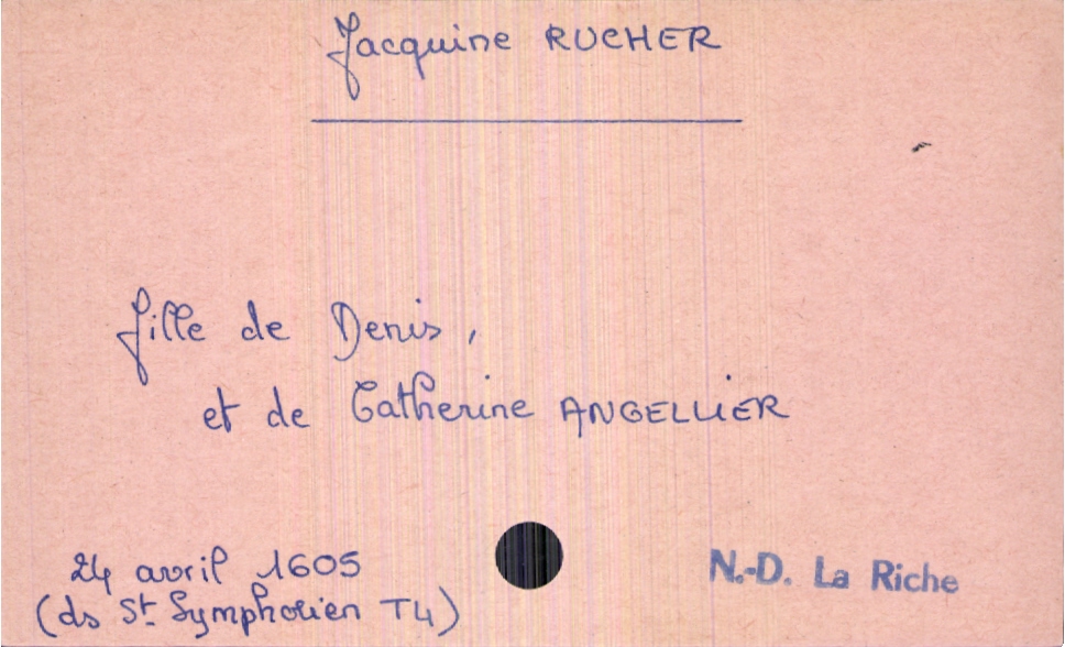 train | Tours | Index cards | e7f50cba-e2d5-4a44-a22c-fa199fca7fef | <root><Baptême><Père><Nom>Rucher</Nom><Prénom>Denis</Prénom></Père><Mère><Nom>Angellier</Nom><Prénom>Catherine</Prénom></Mère><Enfant><Filiation>fille</Filiation><Prénom>Jacquine</Prénom><DateDeNaissance>24 avril 1605</DateDeNaissance><LieuDeNaissance>Saint Symphorien</LieuDeNaissance></Enfant></Baptême><Observations>Mention de Notre Dame La Riche mais bien enregistré dans le registre de Saint Symphorien</Observations></root> | |