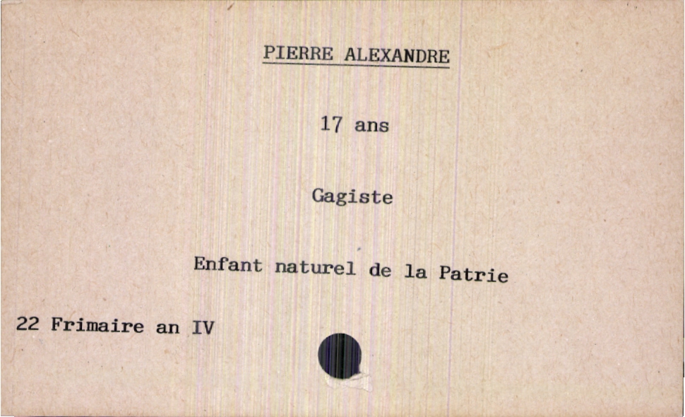 train | Tours | Index cards | 1e3ac70d-2184-450a-8ca8-51fc8798b992 | <root><Décès><Défunt><Nom>Alexandre</Nom><Prénom>Pierre</Prénom><Sexe>H</Sexe><Âge>17 ans</Âge><Profession>Gagiste</Profession></Défunt></Décès><Année>an IV</Année><Mois>frimaire</Mois><Jour>22</Jour><Observations>Parent inconnu : enfant naturel de la Patrie</Observations></root> | |