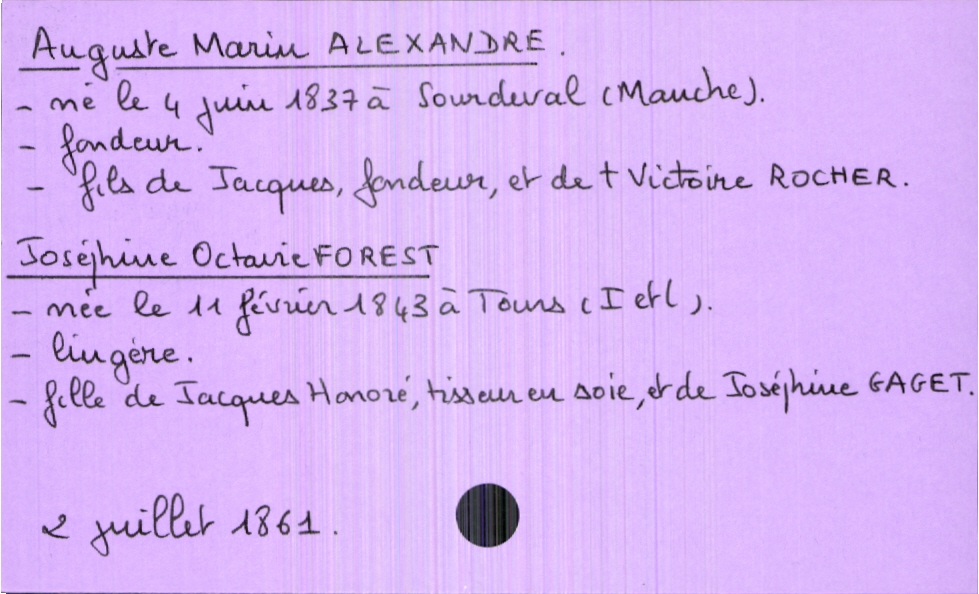 train | Tours | Index cards | 00f93c25-cb6b-4cfd-afa9-67c6c12d28c9 | <root><Mariage><Marié><Nom>Alexandre</Nom><Prénom>Auguste Marin</Prénom><Profession>fondeur</Profession><DateDeNaissance>4 juin 1837</DateDeNaissance><LieuDeNaissance>Sourdeval (Manche)</LieuDeNaissance><Père><Nom>Alexandre</Nom><Prénom>Jacques</Prénom></Père><Mère><Nom>Rocher</Nom><Prénom>Victoire</Prénom><Statut>décédée</Statut></Mère></Marié><Mariée><Nom>Forest</Nom><Prénom>Joséphine Octavie</Prénom><Profession>lingère</Profession><DateDeNaissance>11 février 1843</DateDeNaissance><LieuDeNaissance>Tours (Indre et Loire)</LieuDeNaissance><Père><Nom>Forest</Nom><Prénom>Jacques Honoré</Prénom><Profession>tisseur en soie</Profession></Père><Mère><Nom>Gaget</Nom><Prénom>Joséphine</Prénom></Mère></Mariée></Mariage><Année>1861</Année><Mois>juillet</Mois><Jour>2</Jour></root> | |