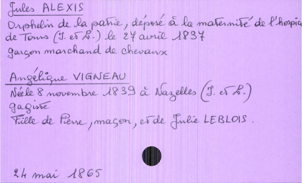 train | Tours | Index cards | 12c85ede-44f4-4288-90dd-9f0675b6a1b4 | <root><Mariage><Marié><Nom>Alexis</Nom><Prénom>Jules</Prénom><Profession>garçon marchand de chevaux</Profession><DateDeNaissance>27 avril 1837</DateDeNaissance><LieuDeNaissance>Tours (Indre et Loire)</LieuDeNaissance></Marié><Mariée><Nom>Vigneau</Nom><Prénom>Angélique</Prénom><Profession>gagiste</Profession><DateDeNaissance>8 novembre 1839</DateDeNaissance><LieuDeNaissance>Nazelles (Indre et Loire)</LieuDeNaissance><Père><Nom>Vigneau</Nom><Prénom>Pierre</Prénom><Profession>maçon</Profession></Père><Mère><Nom>Leblois</Nom><Prénom>Julie</Prénom></Mère></Mariée></Mariage><Année>1865</Année><Mois>mai</Mois><Jour>24</Jour><Observations>Marié : parent inconnu : Orphelin de la patrie, déposé à la maternité de l'hospice de Tours</Observations></root> | |