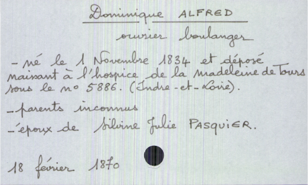 train | Tours | Index cards | 3b6a1e19-5352-4a92-8300-cd6e3e50534c | <root><Décès><Défunt><Nom>Alfred</Nom><Prénom>Dominique</Prénom><Sexe>H</Sexe><DateDeNaissance>1 novembre 1834</DateDeNaissance><LieuDeNaissance>déposé naissant à l'hospice de la madeleine de Tours sous le n° 5886 (Indre-et-Loire)</LieuDeNaissance><Profession>ouvrier boulanger</Profession><Statut>marié(e)</Statut></Défunt><Conjoint><Nom>Pasquier</Nom><Prénom>Silvine Julie</Prénom></Conjoint></Décès><Année>1870</Année><Mois>février</Mois><Jour>18</Jour><Observations>parents inconnus</Observations></root> | |