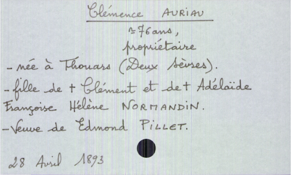 train | Tours | Index cards | 180d2af7-3ac4-40ce-9117-adabcb47d212 | <root><Décès><Défunt><Nom>Auriau</Nom><Prénom>Clémence</Prénom><Sexe>F</Sexe><Âge>76 ans</Âge><LieuDeNaissance>Thouars (Deux Sèvres)</LieuDeNaissance><Profession>propriétaire</Profession><Statut>veuf(ve)</Statut></Défunt><Conjoint><Nom>Pillet</Nom><Prénom>Edmond</Prénom><Statut>décédé(e)</Statut></Conjoint><Père><Nom>Auriau</Nom><Prénom>Clément</Prénom><Statut>décédé</Statut></Père><Mère><Nom>Normandin</Nom><Prénom>Adélaïde Françoise Hélène</Prénom><Statut>décédée</Statut></Mère></Décès><Année>1893</Année><Mois>avril</Mois><Jour>28</Jour></root> | |