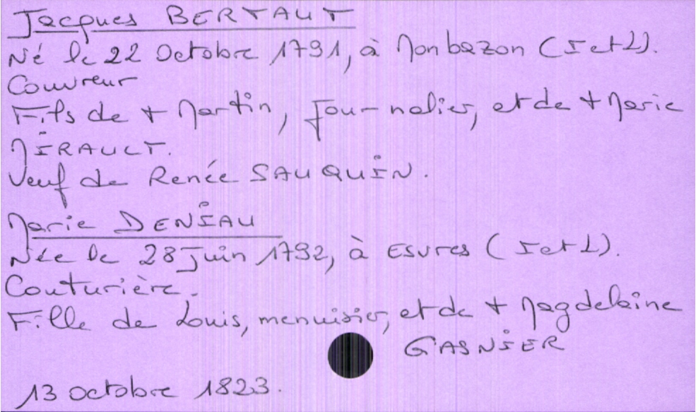 train | Tours | Index cards | 2b29be52-0edb-4d46-9229-b86669f84375 | <root><Mariage><Marié><Nom>Bertaut</Nom><Prénom>Jacques</Prénom><Profession>couvreur</Profession><DateDeNaissance>22 octobre 1791</DateDeNaissance><Statut>veuf</Statut><LieuDeNaissance>Monbazon (Indre et Loire)</LieuDeNaissance><ConjointPremièreNoce><Nom>Sauquin</Nom><Prénom>Renée</Prénom></ConjointPremièreNoce><Père><Nom>Bertaut</Nom><Prénom>Martin</Prénom><Profession>journalier</Profession><Statut>décédé</Statut></Père><Mère><Nom>Mirault</Nom><Prénom>Marie</Prénom><Statut>décédée</Statut></Mère></Marié><Mariée><Nom>Deniau</Nom><Prénom>Marie</Prénom><Profession>couturière</Profession><DateDeNaissance>28 juin 1792</DateDeNaissance><LieuDeNaissance>Esvres (Indre et Loire)</LieuDeNaissance><Père><Nom>Deniau</Nom><Prénom>Louis</Prénom></Père><Mère><Nom>Gasnier</Nom><Prénom>Magdeleine</Prénom><Statut>décédée</Statut></Mère></Mariée></Mariage><Année>1823</Année><Mois>octobre</Mois><Jour>13</Jour></root> | |