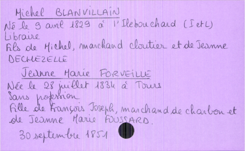 train | Tours | Index cards | 70dd0298-5cb4-4353-b9ed-5b7fe41c970e | <root><Mariage><Marié><Nom>Blanvillain</Nom><Prénom>Michel</Prénom><Profession>libraire</Profession><DateDeNaissance>9 avril 1829</DateDeNaissance><LieuDeNaissance>L'Ile Bouchard (Indre et Loire)</LieuDeNaissance><Père><Nom>Blanvillain</Nom><Prénom>Michel</Prénom><Profession>marchand cloutier</Profession></Père><Mère><Nom>Dechezelle</Nom><Prénom>Jeanne</Prénom></Mère></Marié><Mariée><Nom>Forveille</Nom><Prénom>Jeanne Marie</Prénom><Profession>sans profession</Profession><DateDeNaissance>28 juillet 1834</DateDeNaissance><LieuDeNaissance>Tours</LieuDeNaissance><Père><Nom>Forveille</Nom><Prénom>François Joseph</Prénom><Profession>marchand de charbon</Profession></Père><Mère><Nom>Foussard</Nom><Prénom>Jeanne Marie</Prénom></Mère></Mariée></Mariage><Année>1851</Année><Mois>septembre</Mois><Jour>30</Jour></root> | |