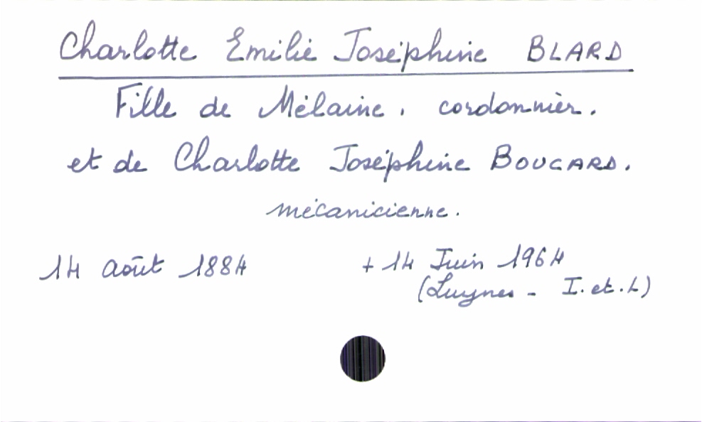 train | Tours | Index cards | 4dcfe9bb-0fc2-4653-b91f-11661c23631b | <root><Baptême><Père><Nom>Blard</Nom><Prénom>Mélaine</Prénom><Profession>cordonnier</Profession></Père><Mère><Nom>Boucard</Nom><Prénom>Charlotte Joséphine</Prénom><Profession>mécanicienne</Profession></Mère><Enfant><Filiation>fille</Filiation><Prénom>Charlotte Emilie Joséphine</Prénom><DateDeNaissance>14 août 1884</DateDeNaissance><DateDeDécès>14 juin 1964</DateDeDécès><LieuDeDécès>Luynes (Indre-et-Loire)</LieuDeDécès></Enfant></Baptême></root> | |