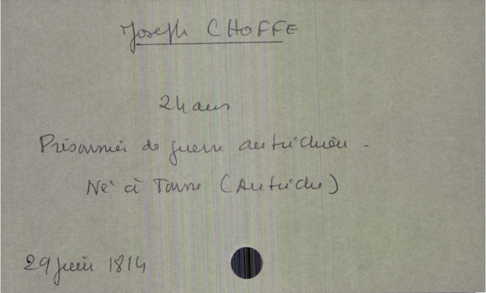 train | Tours | Index cards | bf390560-825a-4e4b-8569-6b37cc71041c | <root><Décès><Défunt><Nom>Choffe</Nom><Prénom>Joseph</Prénom><Sexe>H</Sexe><Âge>24 ans</Âge><LieuDeNaissance>Trune (Autriche)</LieuDeNaissance><Profession>prisonnier de guerre autrichien</Profession></Défunt></Décès><Année>1814</Année><Mois>juin</Mois><Jour>29</Jour></root> | |