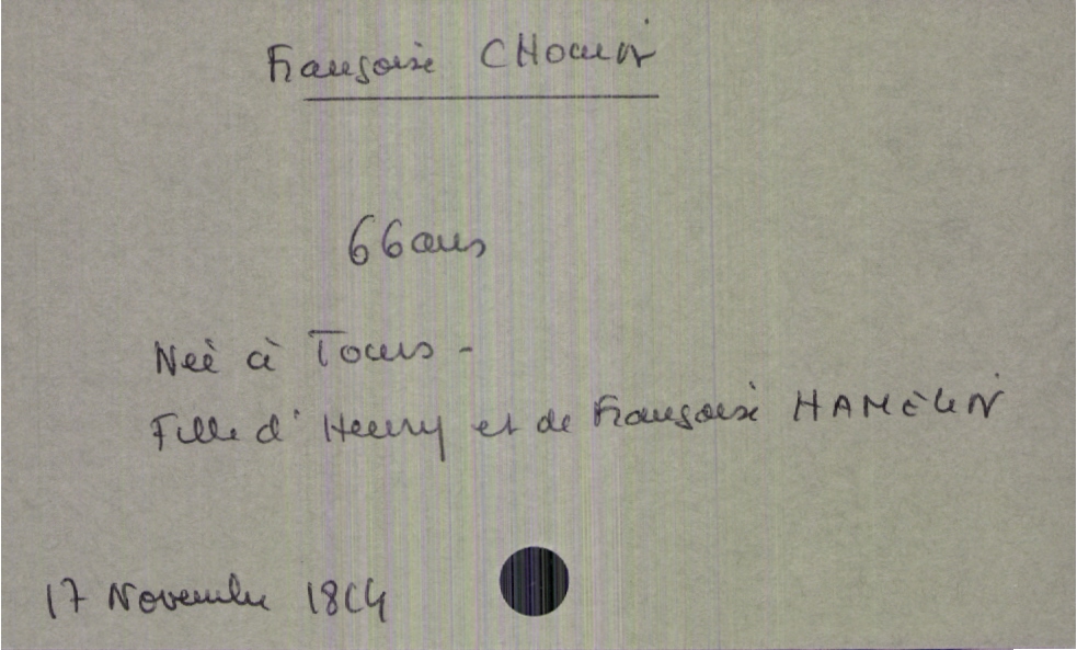 train | Tours | Index cards | 824e3965-8b0c-4814-8cc8-5414d4052b8c | <root><Décès><Défunt><Nom>Chouin</Nom><Prénom>Françoise</Prénom><Sexe>F</Sexe><Âge>66 ans</Âge><LieuDeNaissance>Tours</LieuDeNaissance></Défunt><Père><Nom>Chouin</Nom><Prénom>Henry</Prénom></Père><Mère><Nom>Hamelin</Nom><Prénom>Françoise</Prénom></Mère></Décès><Année>1814</Année><Mois>novembre</Mois><Jour>17</Jour></root> | |