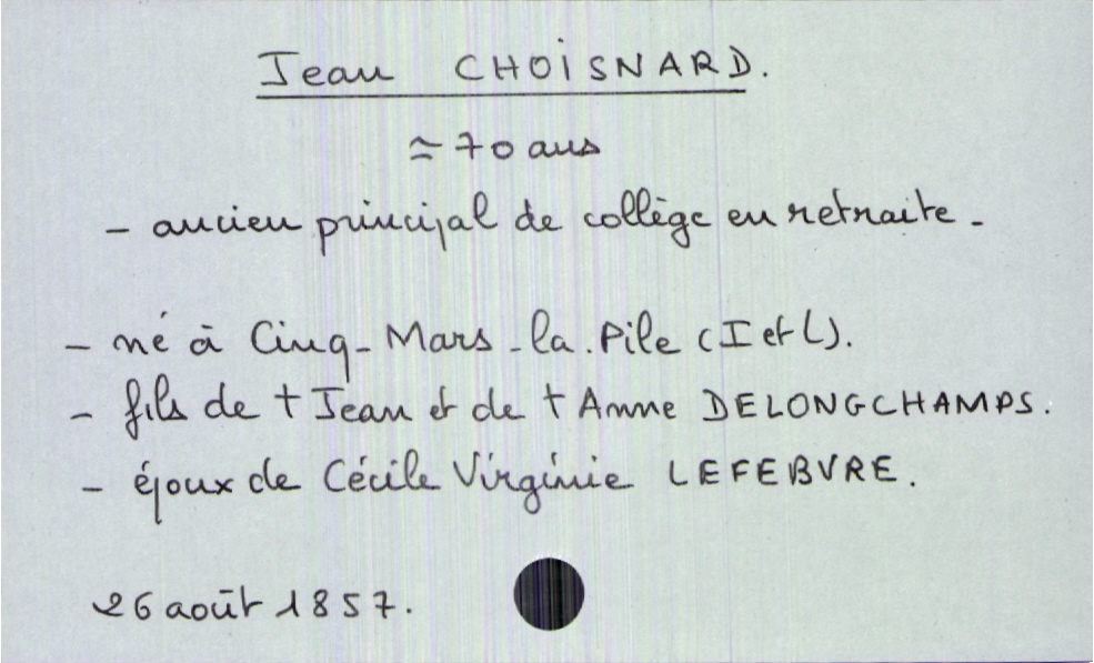 train | Tours | Index cards | d56f22f0-0808-46a5-8624-56e234e47b23 | <root><Décès><Défunt><Nom>Choisnard</Nom><Prénom>Jean</Prénom><Sexe>H</Sexe><Âge>70 ans</Âge><LieuDeNaissance>Cinq-Mars-la-Pile (Indre et Loire)</LieuDeNaissance><Profession>ancien principal de collège en retraite</Profession><Statut>marié(e)</Statut></Défunt><Conjoint><Nom>Lefebvre</Nom><Prénom>Cécile Virgine</Prénom></Conjoint><Père><Nom>Choisnard</Nom><Prénom>Jean</Prénom><Statut>décédé</Statut></Père><Mère><Nom>Delongchamps</Nom><Prénom>Anne</Prénom><Statut>décédée</Statut></Mère></Décès><Année>1857</Année><Mois>août</Mois><Jour>26</Jour></root> |