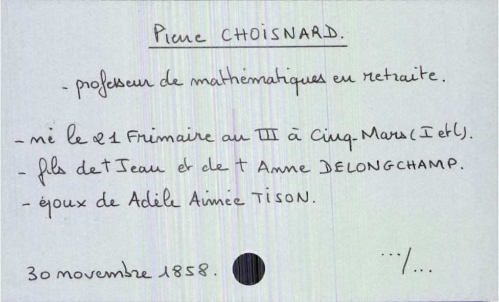 train | Tours | Index cards | 449d1d69-da9d-4e48-a131-20ed2967ea89 | <root><Décès><Défunt><Nom>Choisnard</Nom><Prénom>Pierre</Prénom><Sexe>H</Sexe><DateDeNaissance>21 frimaire an III</DateDeNaissance><LieuDeNaissance>Cinq-Mars (Indre et Loire)</LieuDeNaissance><Profession>professeur de mathématiques en retraite</Profession><Statut>marié(e)</Statut></Défunt><Conjoint><Nom>Tison</Nom><Prénom>Adèle Aimée</Prénom></Conjoint><Père><Nom>Choisnard</Nom><Prénom>Jean</Prénom><Statut>décédé</Statut></Père><Mère><Nom>Delongchamp</Nom><Prénom>Anne</Prénom><Statut>décédée</Statut></Mère></Décès><Année>1858</Année><Mois>novembre</Mois><Jour>30</Jour></root> | |