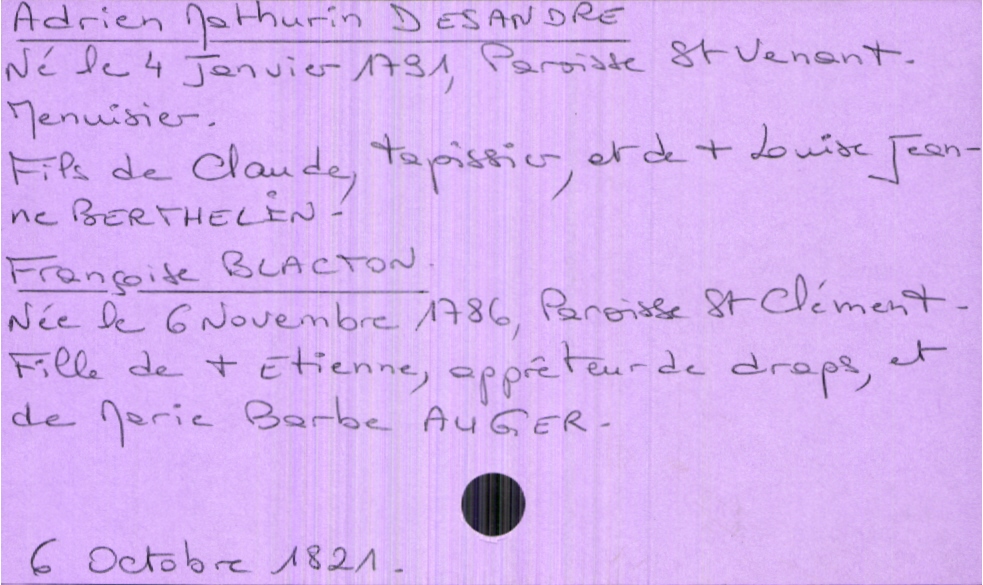 train | Tours | Index cards | b071eca3-14c6-4052-803a-20ca683bb87a | <root><Mariage><Marié><Nom>Desandre</Nom><Prénom>Adrien Mathurin</Prénom><Profession>menuisier</Profession><DateDeNaissance>4 janvier 1791</DateDeNaissance><LieuDeNaissance>paroisse Saint Venant</LieuDeNaissance><Père><Nom>Desandre</Nom><Prénom>Claude</Prénom><Profession>tapissier</Profession></Père><Mère><Nom>Berthelin</Nom><Prénom>Louise Jeanne</Prénom><Statut>décédée</Statut></Mère></Marié><Mariée><Nom>Blacton</Nom><Prénom>Françoise</Prénom><DateDeNaissance>6 novembre 1786</DateDeNaissance><LieuDeNaissance>Paroisse Saint Clément</LieuDeNaissance><Père><Nom>Blacton</Nom><Prénom>Etienne</Prénom><Profession>apprêteur de draps</Profession><Statut>décédé</Statut></Père><Mère><Nom>Augier</Nom><Prénom>Marie Barbe</Prénom></Mère></Mariée></Mariage><Année>1821</Année><Mois>octobre</Mois><Jour>6</Jour></root> | |