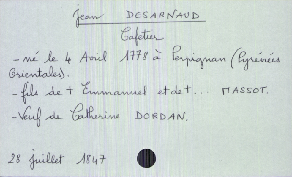 train | Tours | Index cards | e652f39b-472d-4ad1-a121-0d49e0282df6 | <root><Décès><Défunt><Nom>Desarnaud</Nom><Prénom>Jean</Prénom><Sexe>H</Sexe><DateDeNaissance>4 avril 1778</DateDeNaissance><LieuDeNaissance>Perpignan (Pyrénées Orientales)</LieuDeNaissance><Profession>cafetier</Profession><Statut>veuf(ve)</Statut></Défunt><Conjoint><Nom>Dordan</Nom><Prénom>Catherine</Prénom></Conjoint><Père><Nom>Desarnaud</Nom><Prénom>Emmanuel</Prénom><Statut>décédé</Statut></Père><Mère><Nom>Massot</Nom><Statut>décédée</Statut></Mère></Décès><Année>1847</Année><Mois>juillet</Mois><Jour>28</Jour><Observations>prénom de la mère pas lu</Observations></root> | |