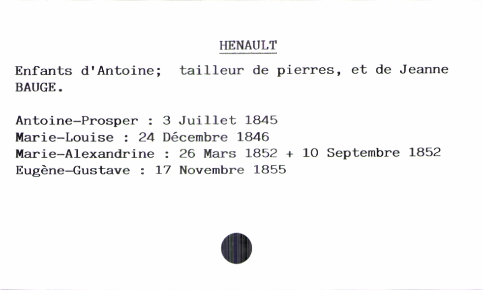 train | Tours | Index cards | db3abcb5-e707-4649-8e0c-2f4b6ff1a0e5 | <root><Baptême><Père><Nom>Henault</Nom><Prénom>Antoine</Prénom><Profession>tailleur de pierres</Profession></Père><Mère><Nom>Bauge</Nom><Prénom>Jeanne</Prénom></Mère><Enfant><Filiation>fils</Filiation><Prénom>Eugène-Gustave</Prénom><DateDeNaissance>17 novembre 1855</DateDeNaissance><DateDeDécès>10 septembre 1852</DateDeDécès></Enfant></Baptême></root> | |