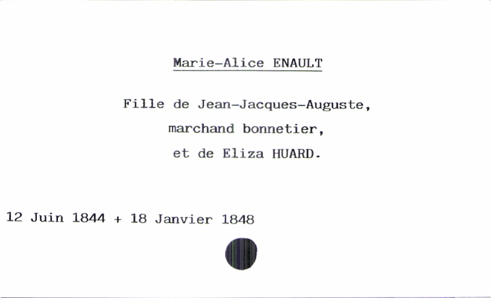 train | Tours | Index cards | 57dc68e3-1a7e-4010-abd4-c19242e36e8f | <root><Baptême><Père><Nom>Enault</Nom><Prénom>Jean-Jacques-Auguste</Prénom><Profession>marchand bonnetier</Profession></Père><Mère><Nom>Huard</Nom><Prénom>Eliza</Prénom></Mère><Enfant><Filiation>fille</Filiation><Prénom>Marie-Alice</Prénom><DateDeNaissance>12 juin 1844</DateDeNaissance><DateDeDécès>18 janvier 1848</DateDeDécès></Enfant></Baptême></root> | |