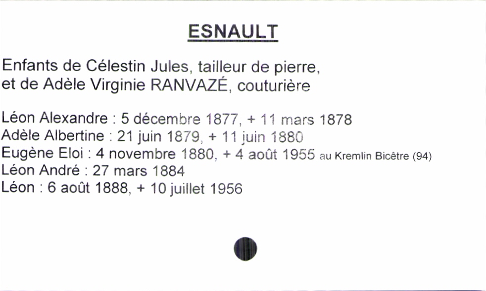 train | Tours | Index cards | bd55b80f-f48a-4a5d-98e4-982f88f8c9bd | <root><Baptême><Père><Nom>Esnault</Nom><Prénom>Célestin Jules</Prénom><Profession>tailleur de pierre</Profession></Père><Mère><Nom>Ranvazé</Nom><Prénom>Adèle Virginie</Prénom><Profession>couturière</Profession></Mère><Enfant><Filiation>fils</Filiation><Prénom>Léon</Prénom><DateDeNaissance>6 août 1888</DateDeNaissance><DateDeDécès>10 juillet 1956</DateDeDécès><LieuDeDécès>Kremlin Bicêtre (94)</LieuDeDécès></Enfant></Baptême></root> | |