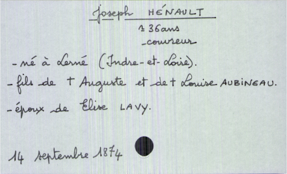 train | Tours | Index cards | 8ba2085e-dad3-47fe-b633-bd312c699056 | <root><Décès><Défunt><Nom>Hénault</Nom><Prénom>Joseph</Prénom><Sexe>H</Sexe><Âge>36 ans</Âge><LieuDeNaissance>Lerné (Indre-et-Loire)</LieuDeNaissance><Profession>couvreur</Profession><Statut>marié(e)</Statut></Défunt><Conjoint><Nom>Lavy</Nom><Prénom>Elise</Prénom></Conjoint><Père><Nom>Hénault</Nom><Prénom>Auguste</Prénom><Statut>décédé</Statut></Père><Mère><Nom>Aubineau</Nom><Prénom>Auguste</Prénom><Statut>décédée</Statut></Mère></Décès><Année>1874</Année><Mois>septembre</Mois><Jour>14</Jour></root> | |
