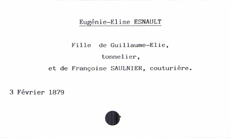 train | Tours | Index cards | 620700c4-e3a3-4159-bbe5-dc0f37311d8e | <root><Baptême><Père><Nom>Esnault</Nom><Prénom>Guillaume-Elie</Prénom><Profession>tonnelier</Profession></Père><Mère><Nom>Saulnier</Nom><Prénom>Françoise</Prénom><Profession>couturière</Profession></Mère><Enfant><Filiation>fille</Filiation><Prénom>Eugénie-Elise</Prénom></Enfant></Baptême><Année>1879</Année><Mois>février</Mois><Jour>3</Jour></root> | |